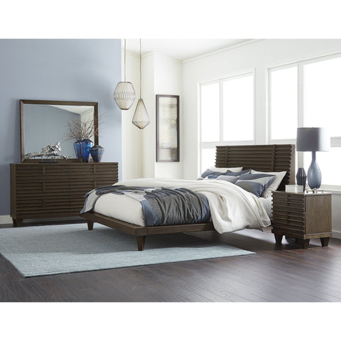 Dramatically designed for maximum eye-catching appeal, the rustic-contemporary Ridgewood Collection blends angles, planes and natural elements to achieve a beautiful composition of style. The solid poplar raised slats that grace every piece of this collection are interrupted by the inset vertical metal headboard accent and drawer pulls. Oak veneer is utilized and highlighted by a rustic burnished oak finish. The final touch that creates contrast to the bold horizontal lines are the supporting feet designed with a 45-degree angle. This study in geometric-inspired design will be a unique addition to your bedroom.